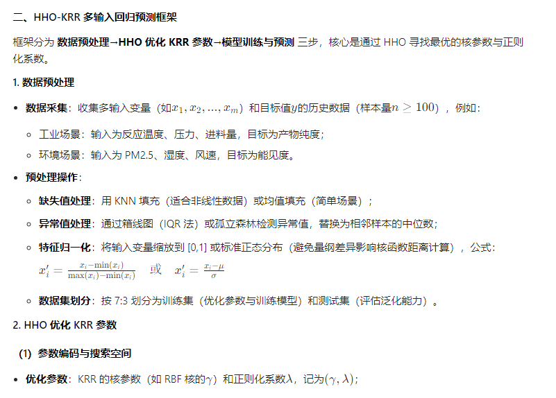 基于哈里斯鹰优化(HHO)与核岭回归(KRR)的多输入回归预测模型(HHO-KRR),是通过 HHO 算法优化 KRR 的核参数与正则化系数,增强模型对多输入变量非线性关系的拟合能力,尤其适用于工业过程参数预测、环境因子关联分析等多变量耦合场景。以下是该模型的技术框架、实现流程及核心优势: