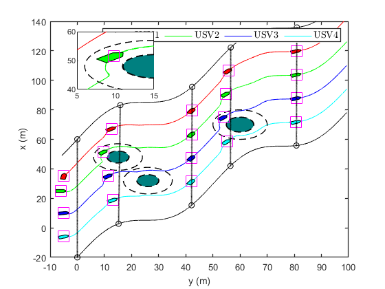 :针对 3 个圆形障碍的分布(如左、中、右各 1 个),双领航器协同生成 “分段绕障轨迹”—— 例如先整体向左侧偏移,避开右侧障碍;再微调航向绕开中间障碍;最后恢复路径避开左侧障碍,同时确保每段轨迹都符合 4 艘 USV 的欠驱动运动特性(仅纵荡、艏摇可控),避免出现无法执行的横荡指令。