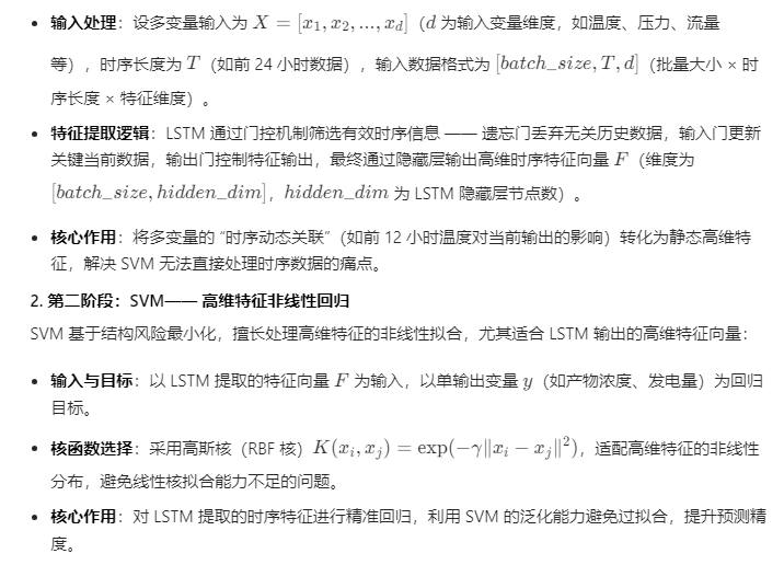 LSTM-SVM 为 “两段式串联模型”,前半段 LSTM 负责时序特征提取,后半段 SVM 负责回归预测,二者通过 “特征向量传递” 实现协同,结构清晰且优势互补: