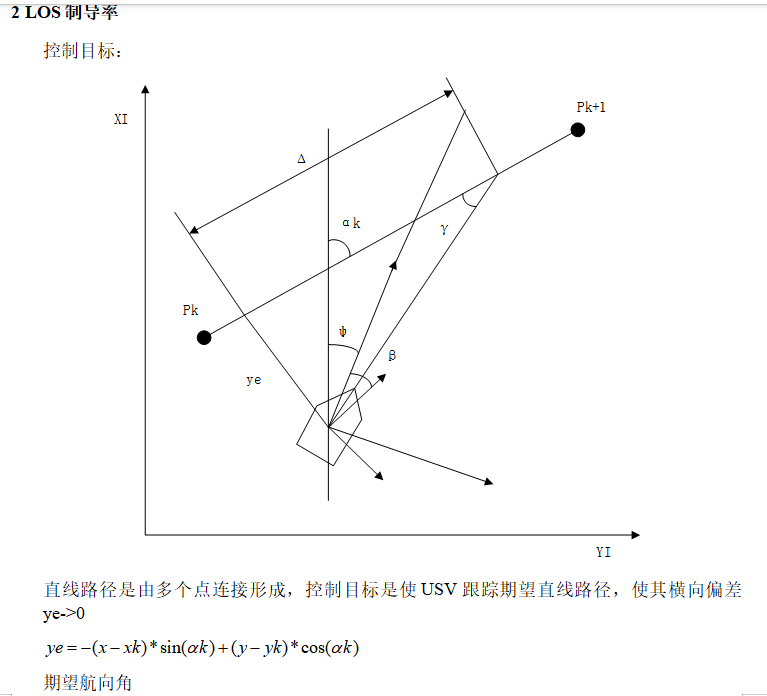 计算:通过 LOS 算法(如传统纯追踪、改进型 LOS)计算当前位置到直线路径的 “横向偏差” 和 “期望艏向角”,确保 USV 始终朝向路径的 “虚拟目标点” 行驶。