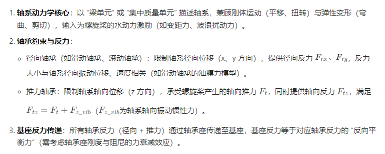 “螺旋桨轴系动力学模型” 需整合轴系振动、多类型轴承约束与基座载荷传递,核心是通过建立 “轴系刚体 + 弹性振动模型”,结合轴承力与基座反力的力学平衡,实现轴系动态响应与约束力的精准计算。