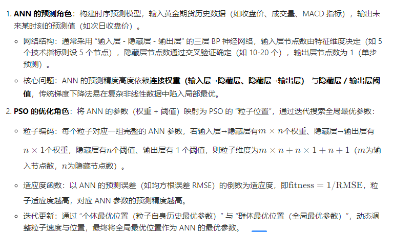 黄金期货数据具有时序性、波动性、非线性特征,传统 ANN(如 BP 神经网络)依赖梯度下降优化参数,易因初始值不当陷入局部最优;PSO 通过模拟 “粒子群体搜索”,为 ANN 寻找全局最优参数组合,二者协同逻辑如下: