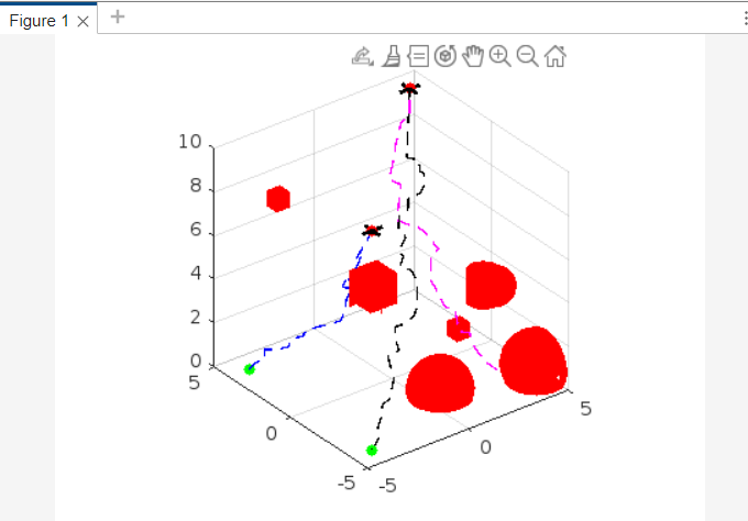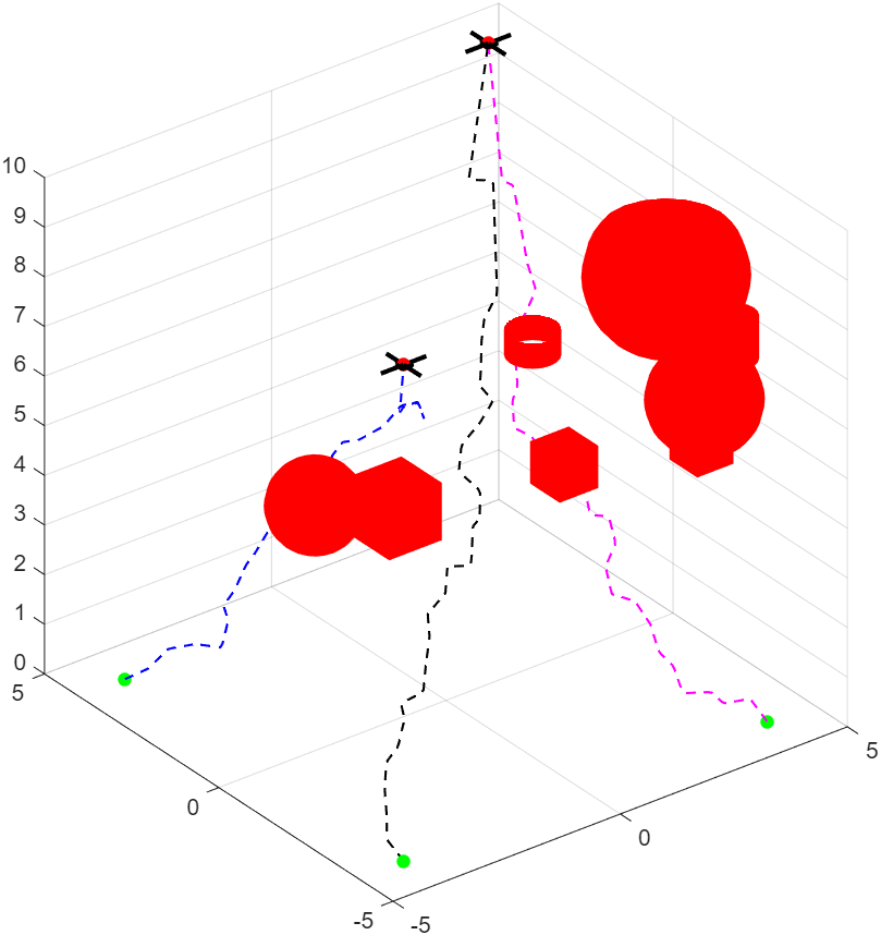 基于 RRT(快速探索随机树)算法的多无人机三维路径规划,核心是通过三维空间随机采样与树扩展,为每架无人机生成避开障碍物的路径,并通过 “冲突检测与消解” 避免无人机间碰撞,最终实现多机在三维环境(如含建筑物、山脉的区域)中的协同导航。