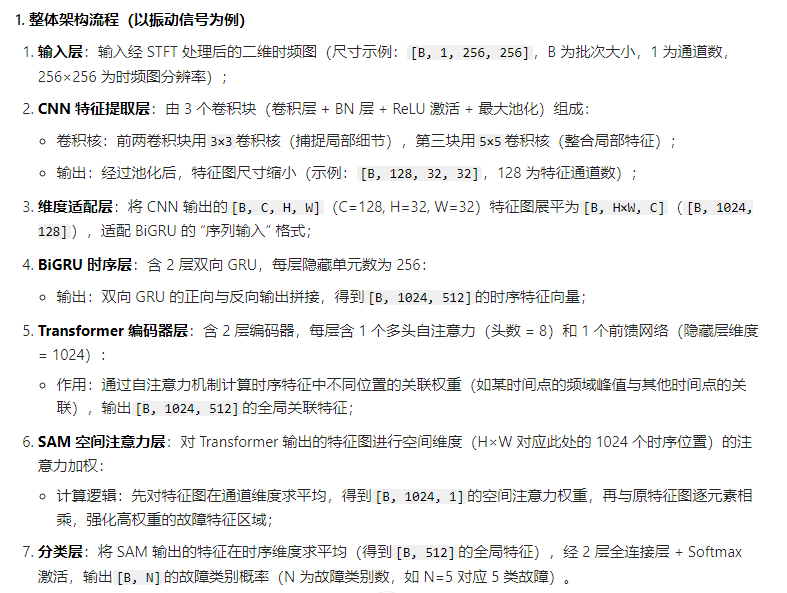 基于 CNN-Transformer-BiGRU-SAM-Attention 的柴油机故障诊断模型,核心是通过多模块特征互补提取(CNN 局部特征、BiGRU 时序依赖、Transformer 全局关联)与双重注意力强化(Transformer 自注意力 + SAM 空间注意力),精准捕捉柴油机故障信号(如振动、声压信号)中的关键特征,最终实现对气门故障、活塞磨损、轴承失效等典型故障的高效分类。
