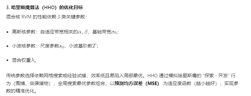 哈里斯鹰算法(HHO)优化改进高斯核与小波核混合的相关向量机(RVM)回归预测,是针对复杂非线性、非平稳数据的高精度预测方案。核心逻辑是:通过混合核函数融合高斯核的平滑拟合能力与小波核的时频局部化优势,再利用 HHO 优化核参数与混合权重,解决传统 RVM 核函数单一、参数依赖经验的缺陷,最终提升回归预测精度与泛化能力。