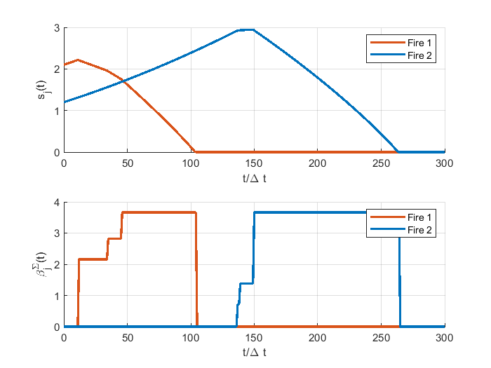 研究建立了火势蔓延与任务分配模型,证实了在特定假设条件下,最优静态任务分配能够保证任务完成时间的一致性;同时求解了静态任务分配的最优解,为初始部署策略与动态部署策略奠定了基础。此外,研究还提出了一种动态任务分配方案,该方案确保每次重新分配都能缩短任务完成时间,并平衡各任务的完成进度。通过 MATLAB 仿真验证了该动态方案的有效性,并与拍卖算法进行了对比分析。