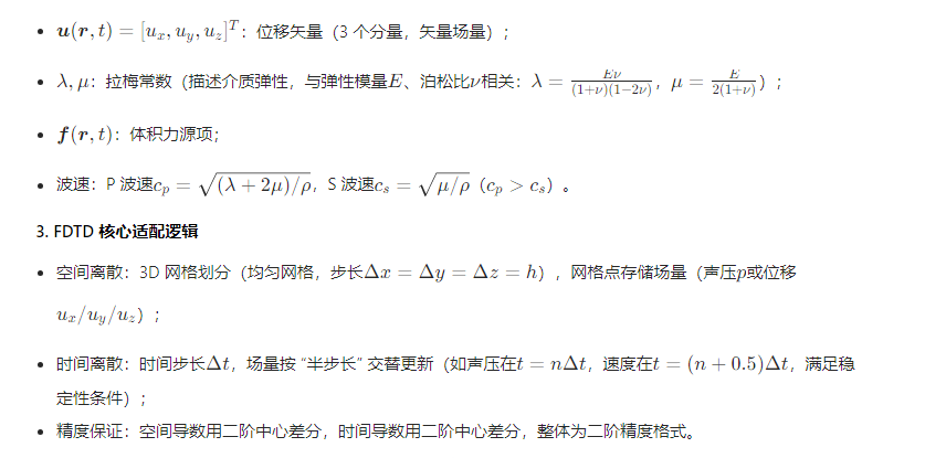 基于时域有限差分(FDTD)方法的 3D 声波与弹性波传播模拟,核心是通过时域离散差分格式求解波动方程,在 3D 网格中迭代更新场量(声压 / 位移 / 应力),结合吸收边界条件抑制边界反射,实现复杂介质(如分层介质、缺陷结构)中波动传播的精准复现。该方法兼顾时域连续性与空间三维性,能捕捉波的散射、折射、模式转换(弹性波 P 波 / S 波转换)等关键现象,适用于声学成像、地震模拟、无损检测等场景。