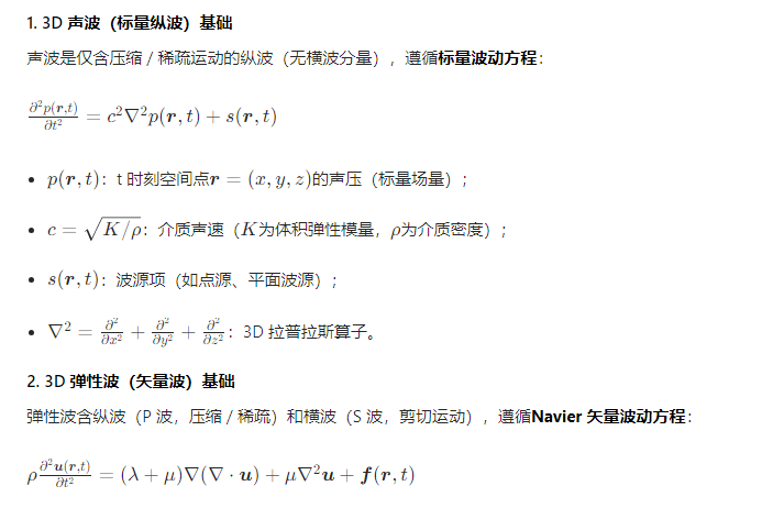 声波是仅含压缩 / 稀疏运动的纵波(无横波分量),遵循标量波动方程: