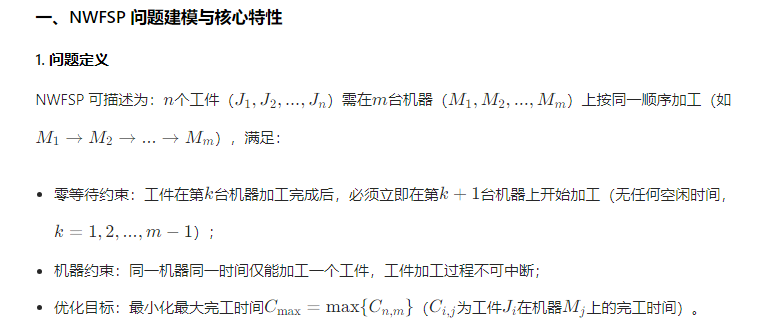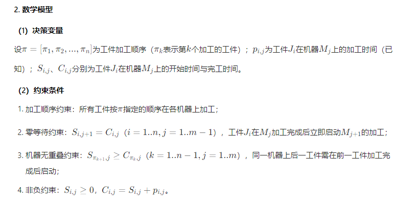 零等待流水车间调度问题(No-Wait Flow Shop Scheduling Problem, NWFSP)是制造业生产调度中的经典组合优化问题,核心约束为 “工件在机器间无空闲等待”,需在满足加工顺序、资源约束的前提下,最小化最大完工时间(Makespan),适用于电子制造、汽车装配、化工连续生产等对生产连续性要求极高的场景。碳黑四角蜂算法(Tar Black Four-Corner Bee Algorithm, TGCOA)是在传统四角蜂算法(GCOA)基础上,融入碳黑吸附、聚集特性改进的启发式算法,兼具全局探索能力与局部开发精度,能高效适配 NWFSP 的离散解空间与约束需求。