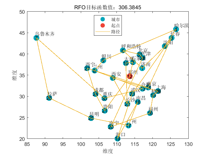 基于碳黑四角蜂算法(TGCOA)和吕佩尔狐算法(RFO)求解 TSP 问题的 MATLAB 实现,支持自定义城市经纬度坐标,可灵活设置目标地区。代码包含算法核心逻辑、距离计算、路径可视化及结果对比功能