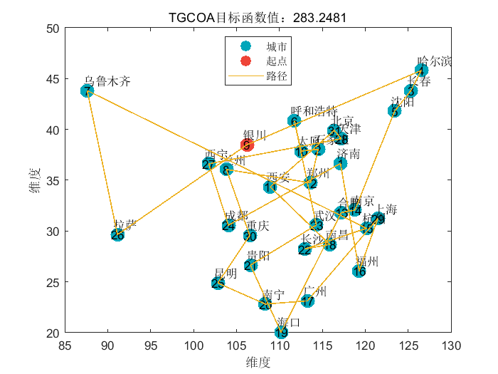 cities矩阵输入目标地区的经纬度(纬度,经度),支持任意数量的城市(建议 5-50 个,过多会增加计算量)。 - 两种智能算法