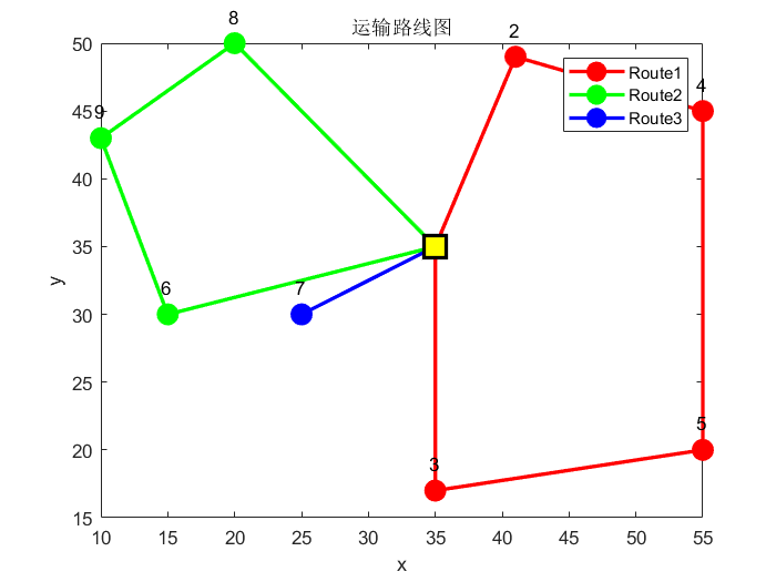每辆车从配送中心出发,服务一系列客户后返回配送中心。