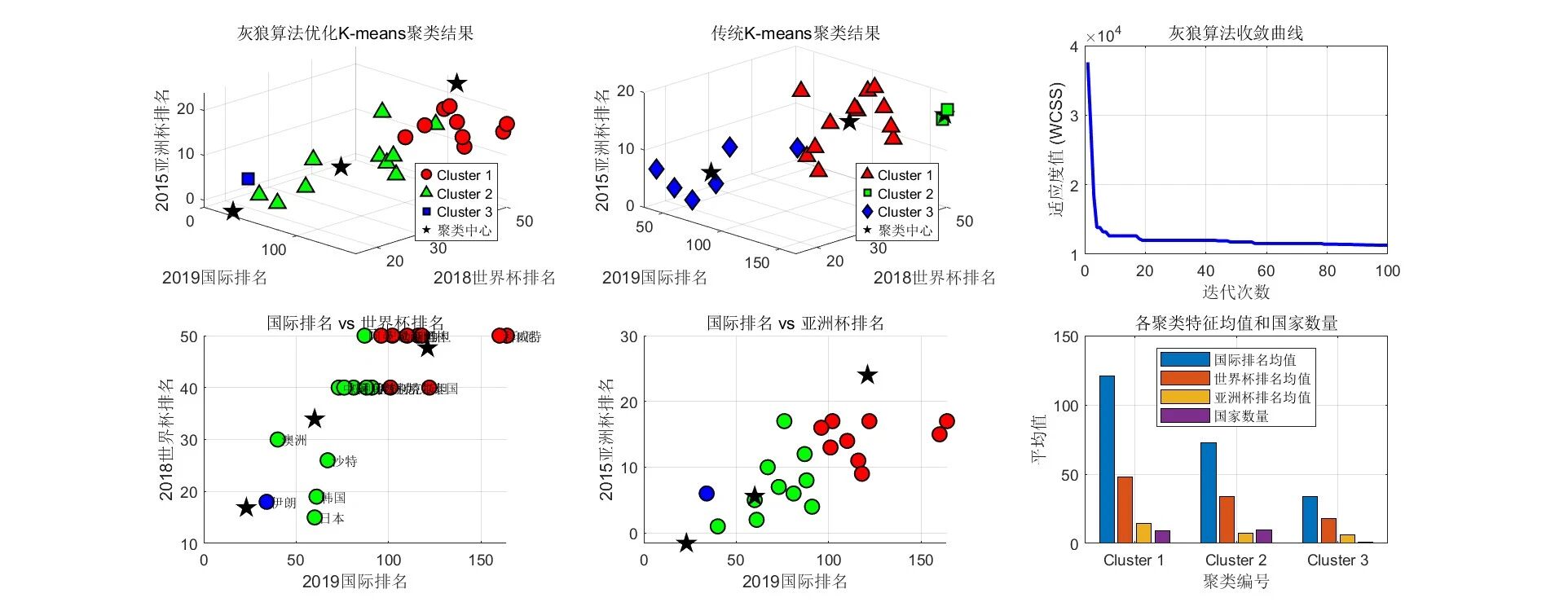 灰狼优化算法(GWO)与K-means 聚类算法结合,用于亚洲足球水平的聚类分析,可以有效解决传统 K-means 对初始聚类中心敏感、易陷入局部最优的问题,提高聚类的准确性和稳定性。以下是完整的实现思路、步骤和代码示例: