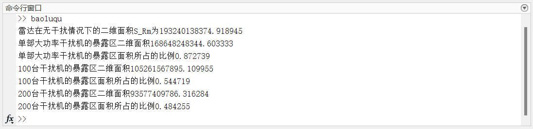 -π/6到π/6)均匀布置多台干扰机,分别计算每台干扰机的干扰贡献并求和,最终得到受多机干扰后的暴露区面积S_Rm100、S_Rm200及对应比例。