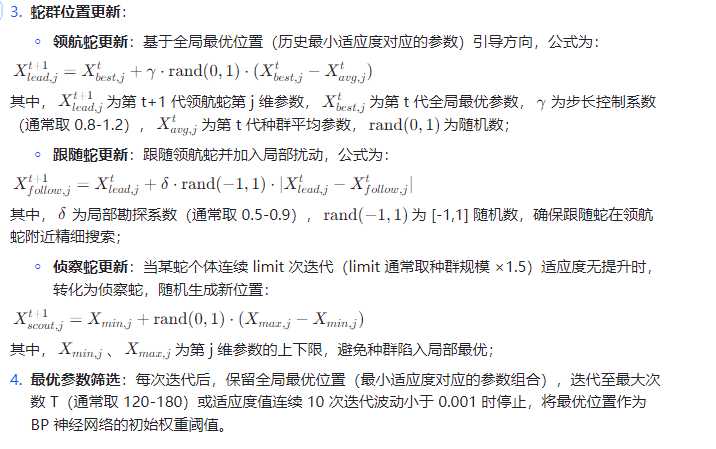 - 跟随蛇:占种群 60%-70%,跟随领航蛇移动,同时在局部区域进行精细勘探(对应 BP 参数的微调优化),通过模仿领航蛇位置与自身随机扰动,提升解的精度;