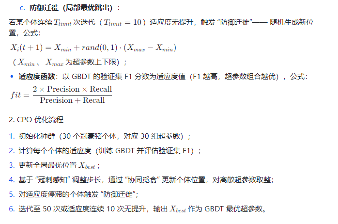 - 冠豪猪算法(CPO):模拟冠豪猪 “冠刺感知环境、协同觅食、防御迁徙” 的生物行为,全局搜索 GBDT 最优超参数,平衡探索与开发能力;