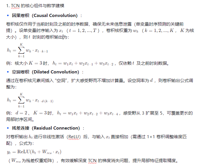 TCN 专为时序数据设计,核心通过因果卷积避免未来信息泄露,同时用残差连接解决深度网络训练梯度消失问题,适配单变量时序的局部模式提取需求。
