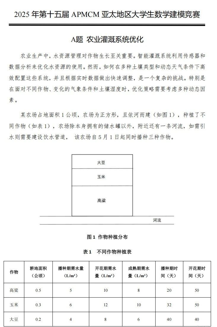 农业生产中,水资源管理对作物生长至关重要。智能灌溉系统利用传感器和数据分析来优化水资源的使用。然而,如何在多种土壤类型和动态天气条件下高效配置这些系统,并且根据实时数据做出快速调整,是一个复杂的挑战。特别是在面对不同作物、变化的气象条件和土壤湿度时,优化策略需要考虑多种动态因素。某农场占地面积 1 公顷,农场为正方形,且依河而建(如图 1),种植了不同作物(如表 1),农场除本身拥有的储水罐以外,附近还有一条河流,如需引水则需要建设饮水管道, 该农场自 5 月 1 日起同时播种三种作物。
