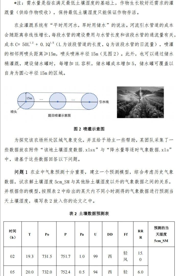 溉量(供给作物吸收),保持最低土壤湿度只能保证作物存活。农业灌溉系统有“平时用河水,旱时用储水”的说法。河流引水管道的成本会随距离非线性增长,每段水管的建设费用与水管长度和该段水管的通流量有关,成本 C= 50L 1.2 + 0.1Q 1.5(L 为该段管道的长度,Q 为该段水管的日流量),喷灌的相邻两喷头距离≥15m,喷头喷淋半径 15m(见图 2)。此外,也可以通过储水桶灌溉,建设储水罐时,每增加 1L 容积,储水罐成本增加 5,储水罐可覆盖以自身为圆心半径 15m 的区域