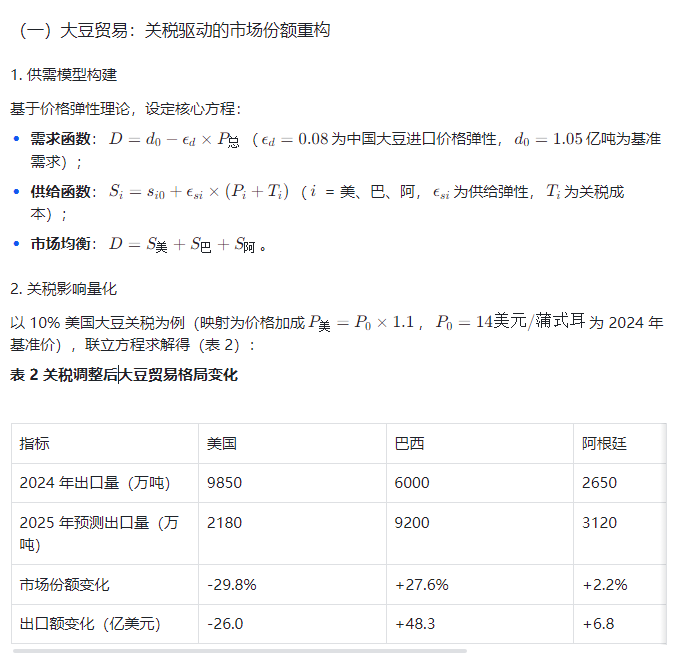 🌾 问题一:大豆贸易影响分析 中国作为全球最大大豆进口国,主要进口来源为美国、巴西、阿根廷,需分析美国关税调整对三国大豆产业的出口量及价值分配影响。 核心参数:进口量、进口价格、关税率,中国大豆需求量设为d,基于价格弹性理论构建供需模型,关税影响体现为价格加成,假设中国需求量等于三国总供应量(需提供历年数据支撑)。 求解路径:标定初始价格后,将10%关税率映射至美国大豆价格,通过市场均衡联立方程计算各国出口量及市场份额占比。