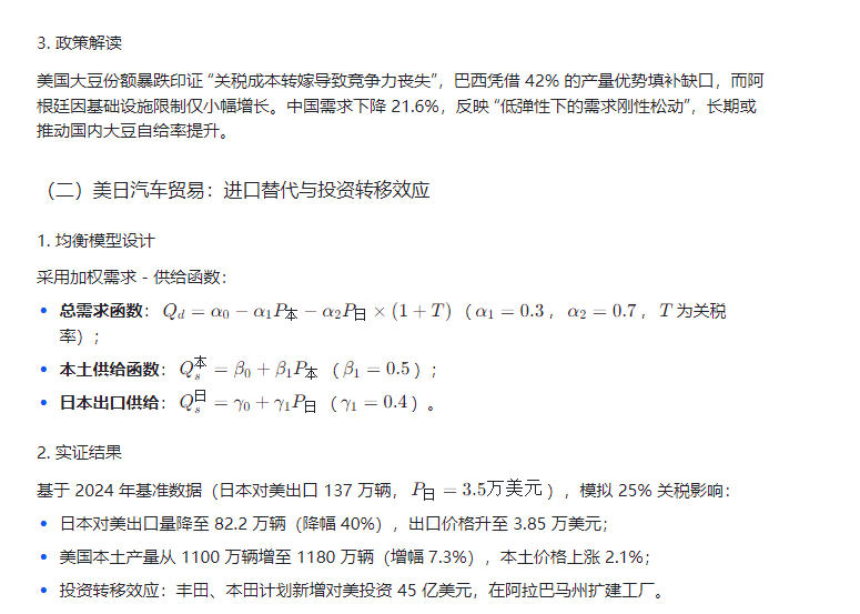 🚗 问题二:美日汽车贸易影响分析 美国为全球第二大汽车市场及最大进口国,日本为主要进口来源,需评估美国加税对日本汽车进口量及制造商对美生产投资的影响。 变量定义:日本汽车初始出口量、美国本土汽车产量、出口价格、本土价格、关税率、总需求量,需求函数呈价格负相关(加权函数形式),供给函数同理。 关税影响机制:美国关税增加导致进口汽车价格上涨、进口量减少(非线性平滑曲线表示),通过美国汽车总需求量与本土+日本供给量的市场均衡模型,求解出口量与本土产量变化。