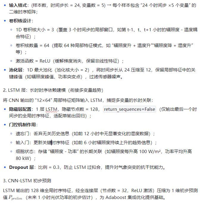 - CNN(1D 卷积):提取多输入变量的局部时序特征(如辐照度骤升、温度短期波动);