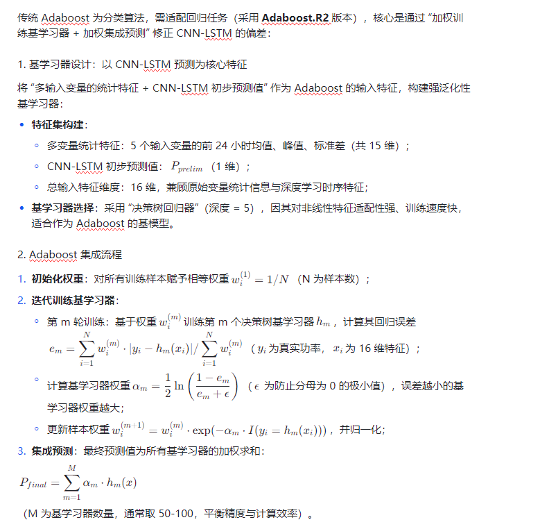 - Adaboost:以 CNN-LSTM 的预测结果为基学习器输入,通过 “加权集成” 修正预测偏差,提升模型泛化性与抗干扰能力。