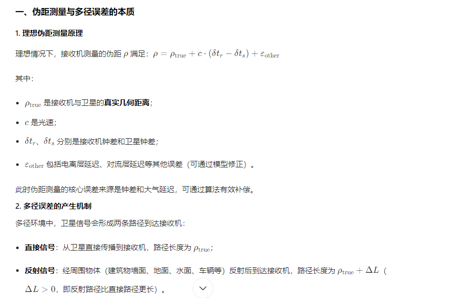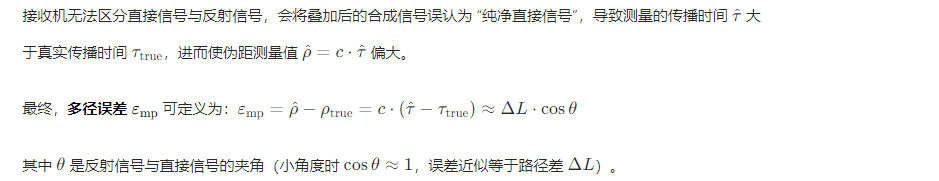 GNSS(如 GPS、北斗、Galileo)伪距测量的核心是通过接收机与卫星之间的信号传播时间计算几何距离,进而解算载体位置。但在多径环境(信号经建筑物、地面、水面等反射后到达接收机)中,反射信号与直接信号叠加,会导致伪距测量值偏离真实几何距离,形成多径误差,这是 GNSS 定位中最主要的误差源之一,严重影响定位精度与稳定性。