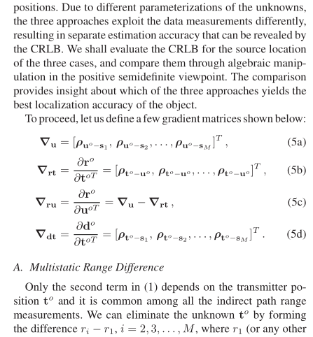 多基地系统通过发射机照射目标物体,并利用多个接收机收集反射信号以确定其位置。在无源相干定位等场景或为提升系统灵活性时,发射机的位置可能未知。本文研究了在发射机位置未知的情况下,仅利用经目标反射的间接路径测量值,或结合发射机到接收机的直射路径测量值进行目标定位的方法。研究表明,通过间接路径与直射路径测量值联合估计目标与发射机位置,相比仅使用间接路径测量值,可消除对发射机位置的依赖,从而获得更优的目标定位结果。针对该联合估计的非线性问题,本文推导了代数闭式解,并通过解析方法证明:在高斯噪声下的小误差区域内,该解法能够达到克拉美 - 罗下界(Cramér–Rao Lower Bound, CRLB)性能。为完善研究并深入分析,本文通过最小化目标定位的估计置信域或均方估计误差,推导了发射机位置未知时的最优接收机布局,并量化了在该最优几何布局下,因发射机位置未知导致的性能损失。仿真结果与理论推导高度一致。