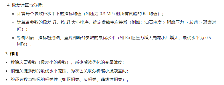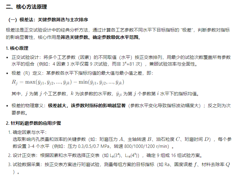 传统单因素试验法需多次重复试验,效率低且无法考虑参数耦合效应;而多目标优化中,各指标(如粗糙度、圆度、效率)的量纲、优先级不同,难以直接比较。因此,采用 **“极差法 + 灰色关联分析”** 的组合方案,其核心逻辑是: