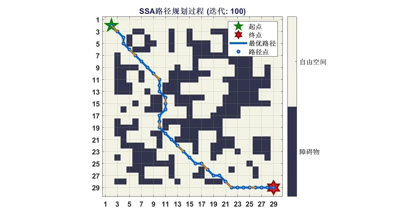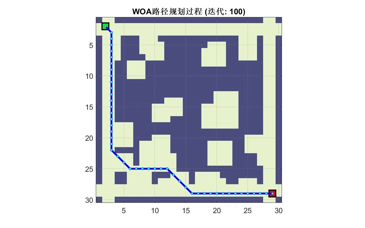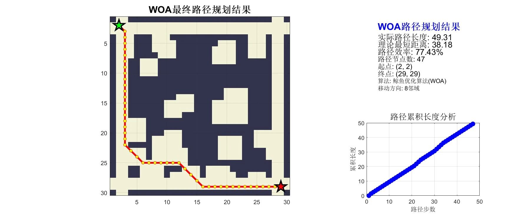 路径规划是移动机器人、无人机等智能系统的核心技术之一,其目标是在复杂环境中寻找一条满足 “无碰撞、短路径、高平滑” 的可行路径。栅格地图因建模直观、环境信息表达清晰,成为路径规划领域最常用的环境建模方法;而鲸鱼优化算法(Whale Optimization Algorithm, WOA)作为 2016 年提出的新型智能优化算法,具有收敛速度快、参数少、全局搜索能力强的优势。但原始 WOA 针对连续空间优化设计,直接应用于离散栅格路径规划时存在 “编码不匹配、避障约束难满足” 等问题。本文从栅格地图建模原理切入,阐述 WOA 适配路径规划的改进策略,结合仿真实验验证其在避障与路径长度优化中的效果,为相关研究者与学生提供清晰的技术参考。