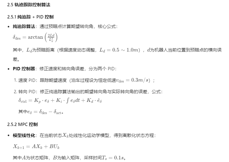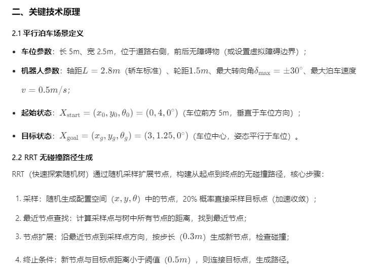 本系统围绕 “路径生成→路径平滑→轨迹跟踪→可视化评估” 全流程,实现轮式机器人平行泊车仿真,核心框架如下: