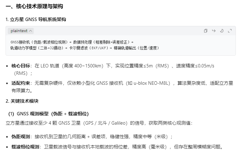 基于 GNSS 的立方星精确轨道确定(OD)导航方法 的完整技术方案与仿真实现,核心适配立方星 “小体积、低功耗、低成本” 的约束,采用 “GNSS 观测建模 + 简化轨道动力学 + 卡尔曼滤波” 架构,实现低轨(LEO)立方星的米级 / 亚米级轨道确定