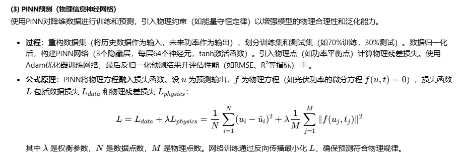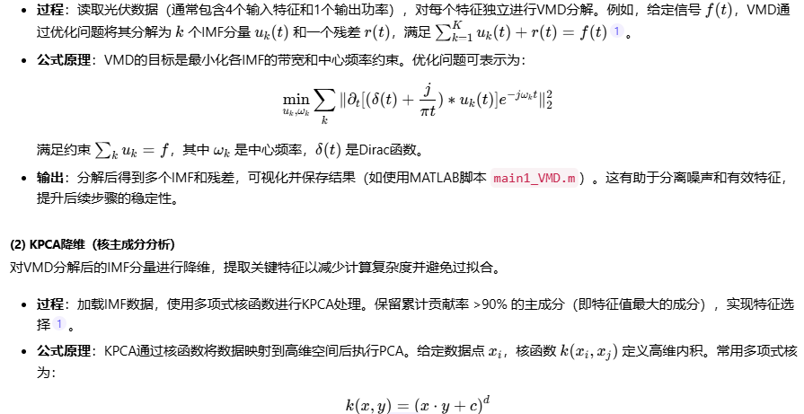 基于引用[1]的描述,我将逐步解释该方法的核心内容。该方法结合了变分模式分解(VMD)、核主成分分析(KPCA)和物理信息神经网络(PINN),用于预测光伏功率时间序列数据。整体目标是提高预测精度和泛化能力,通过数据分解、降维和物理约束来优化模型。以下是详细说明: