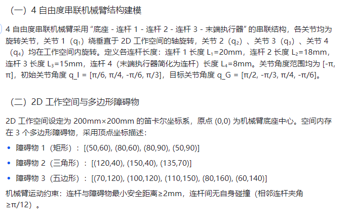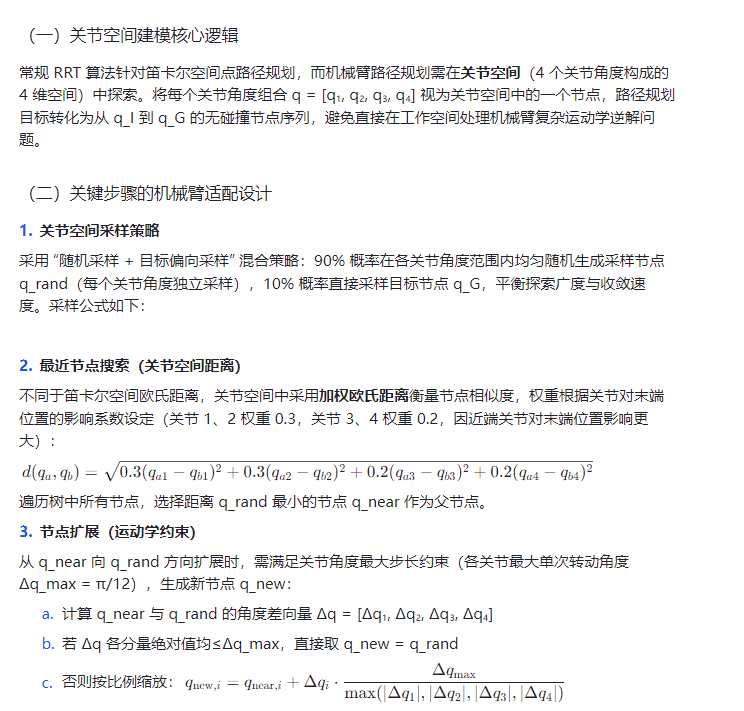 常规 RRT 算法针对笛卡尔空间点路径规划,而机械臂路径规划需在关节空间(4 个关节角度构成的 4 维空间)中探索。将每个关节角度组合 q = [q₁, q₂, q₃, q₄] 视为关节空间中的一个节点,路径规划目标转化为从 q_I 到 q_G 的无碰撞节点序列,避免直接在工作空间处理机械臂复杂运动学逆解问题。