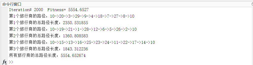 fprintf('第%d个旅行商的总路径长度:%f\n',i,Dis(i));