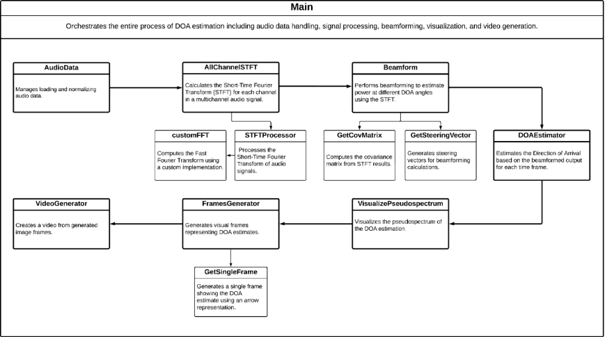 本项目的核心目标是实现一款延迟求和波束形成器(Delay-and-Sum Beamformer),专门用于宽带声源定位。考虑到空间滤波的窄带特性,项目将对每个频段进行独立处理,并通过逐帧执行空间滤波的方式,以适应声源的时变特性。