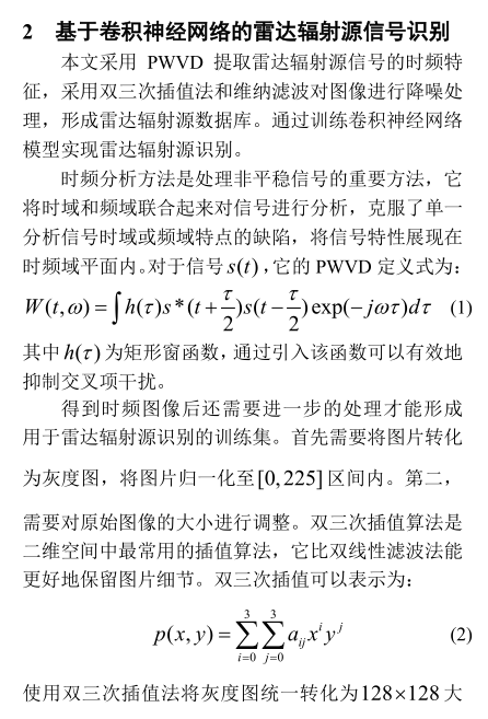 雷达辐射源识(Radar Emitter Identification, REI),最早于上个世纪 60 年代被提出,它是指通过接收雷达电磁信号,分析雷达辐射源个体特征进而识别雷达个体的技术。获取敌方雷达的电子情报是电子支援措施的先导,如果能准确探测雷达信息,根据其强度和特性就可以知道其隐含的危险以及下一步应采取何种战术,同时对敌方雷达开展电子攻击。随着现代武器的不断发展,不断积累有关雷达信号的情报在和平时期具有重要的意义[1]。