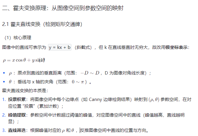 传统识别方法易受复杂背景(树木、建筑物、行人)、光照变化(阴天、逆光)、交通牌倾斜影响,而霍夫变换通过 **“图像空间→参数空间” 的映射 **,能高效检测图像中的直线、圆形等规则形状,恰好适配交通牌的形状特征: