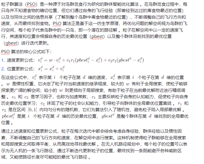 粒子群算法(PSO)作为一种基于群体智能的优化算法,通过模拟鸟群觅食行为,展现出强大的全局搜索能力。在 PSO 中,每个粒子代表一个潜在的路径解,粒子通过跟踪自身的历史最优位置和群体的全局最优位置来调整飞行速度和方向,从而在搜索空间中寻找最优解。并且,PSO 算法具有灵活的成本函数设计能力,能够将威胁成本和路径成本等多个因素纳入考虑范围,通过合理设置成本函数的权重,实现对不同成本的平衡和优化。因此,PSO 算法为解决复杂山地环境下的无人机路径规划问题提供了新的思路和方法 。
