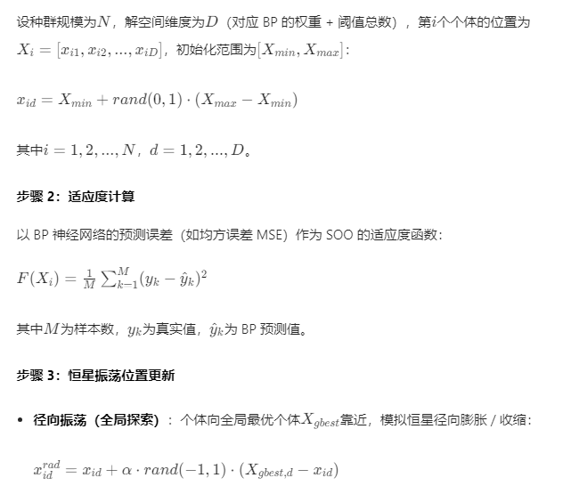 在工业预测、智能分类、环境监测等实际场景中,优化问题往往涉及多目标约束(如模型精度、训练耗时、复杂度、能耗等),且传统 BP 神经网络存在易陷入局部最优、收敛速度慢、初始权重阈值敏感等缺陷。恒星振荡优化算法(Stellar Oscillation Optimization, SOO) 是一种模拟恒星径向 / 非径向振荡物理机制的新型智能优化算法,具备全局探索能力强、收敛稳定性高的优势;多目标粒子群算法(MOPSO) 则擅长处理多目标优化问题,能生成帕累托(Pareto)最优解集。