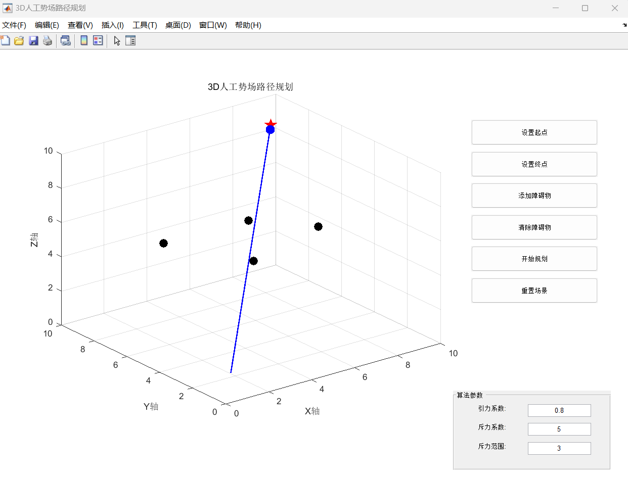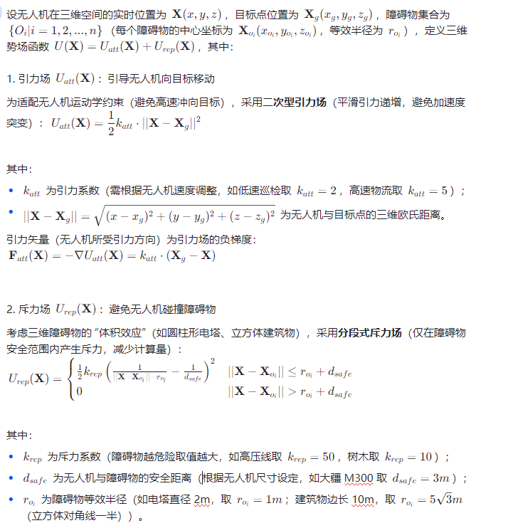 人工势场法(APF)凭借实时性强(计算复杂度 O (1),远低于 RRT 的 O (n))、路径平滑(符合无人机连续运动需求)、参数可调(适配不同场景) 的优势,成为无人机三维路径规划的核心方案。但传统 APF 存在 “局部极小值(无人机陷入障碍物与目标点之间的势场平衡,无法前进)”“目标不可达(目标点附近斥力抵消引力)” 等问题,需针对三维场景与无人机特性进行改进,实现 “避障安全、路径可行、响应实时” 的规划目标。