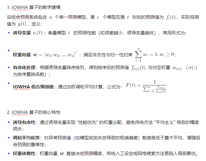 - 传统 IOWHA 算子的参数依赖:诱导有序加权调和平均(IOWHA)算子通过 “诱导变量排序 + 加权调和” 实现动态权重分配,但诱导变量选择(如误差平方和、信息熵)与权重向量初始化依赖人工经验,易导致 “最优权重漏选”—— 例如,在设备故障预测中,经验权重可能低估早期故障的微弱特征,导致预测滞后。