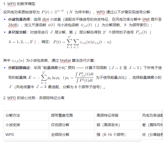 - WPD:将非平稳的风电功率信号分解为 “不同频段的平稳子信号”(如低频段对应季节趋势、高频段对应阵风波动),降低信号复杂度;