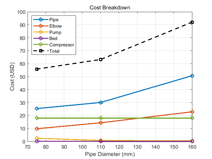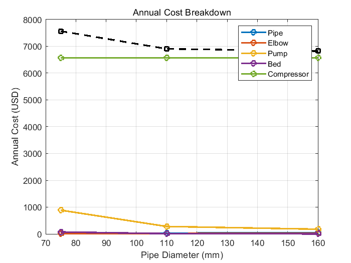 系统中安装了 5 个 90 度弯管,同时使用了固定床塔。塔内填充材料的直径为 15 毫米,空隙率为 0.4。总电费按 0.10 美元 / 千瓦时(kWh)计算。为确定能实现最高效、最低成本输送流程的管道,工作人员对三种不同直径的管道进行了计算分析。