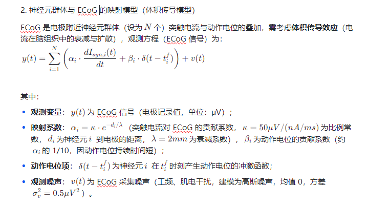 - 宏观 - 微观映射模糊:ECoG 是大量神经元(约 10³-10⁴个)活动的叠加,传统方法简化为 “单神经元 - 单电极” 映射,忽略神经元群体的空间整合效应(如体积传导、同步放电),导致反演结果缺乏生理意义。
