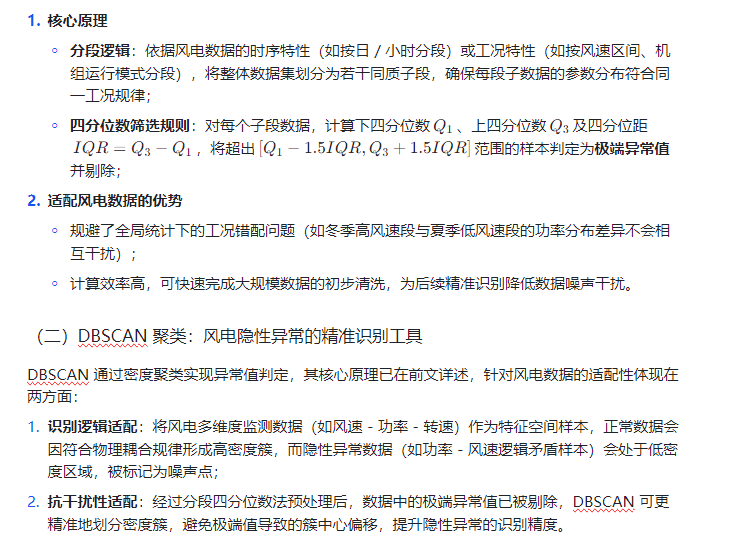 分段四分位数法 + DBSCAN 组合方案的核心破局逻辑是 **“分段粗筛降干扰 + 密度精判提精度”**:先按风电数据的时序或工况特征进行分段,通过四分位数法对每段数据做初步异常过滤,剔除明显的极端异常值;再将预处理后的数据输入 DBSCAN 模型,基于密度聚类识别隐性的工况耦合异常点,既解决了单一方法的局限性,又实现了异常值的分层精准剔除。