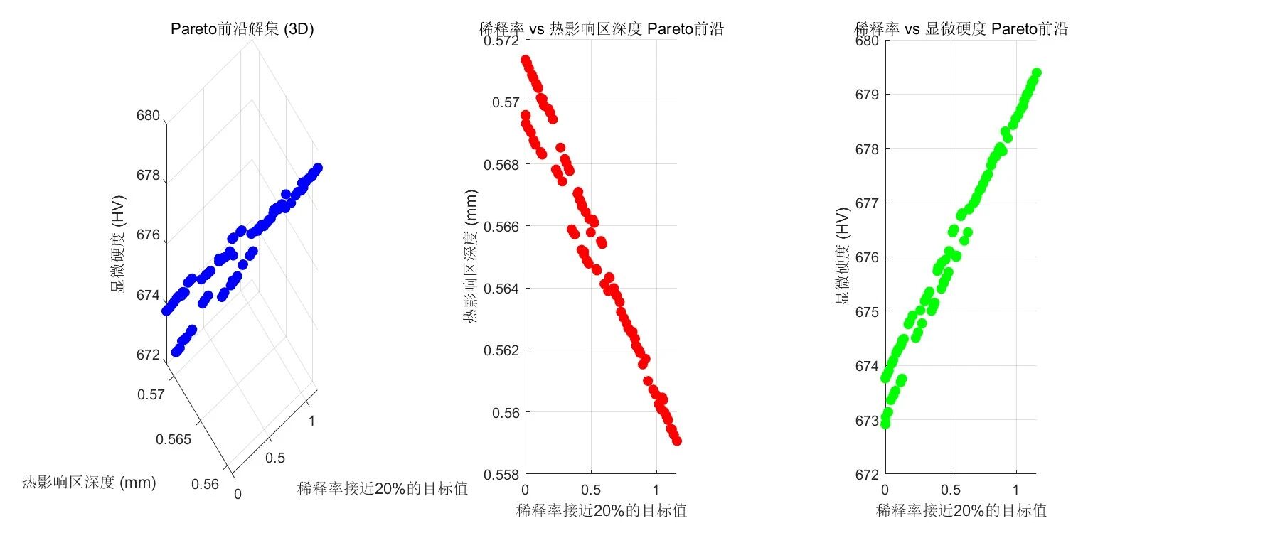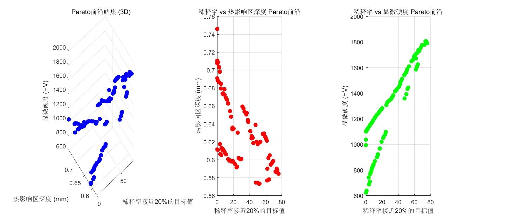 以提高熔覆层硬度、降低孔隙率、提升加工效率等多个目标为导向,NSGA-Ⅱ 算法通过上述三大核心机制的协同作用,能够在一次优化过程中同时处理多个相互冲突的目标,生成一组均匀分布的 Pareto 最优解集。决策者可以根据实际生产需求,如产品对硬度和孔隙率的严格要求、生产时间和成本的限制等,从 Pareto 解集中灵活选择最适合的工艺参数组合,实现激光熔覆工艺的最优化配置 。
