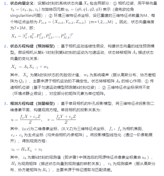 系统建模是卡尔曼滤波适配单目SLAM的核心,需将“相机位姿+三维特征点”纳入状态向量,同时基于相机运动模型与投影模型构建方程:
