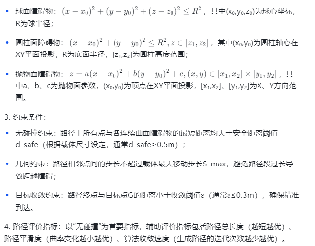 1. 路径规划目标:在存在连续曲面障碍物(如球面、圆柱面、抛物面等)的三维空间中,生成一条从预设起点S到目标点G的连续路径,满足路径无碰撞、路径长度尽可能短、曲率平滑可行驶(适配移动机器人或无人机等载体)。